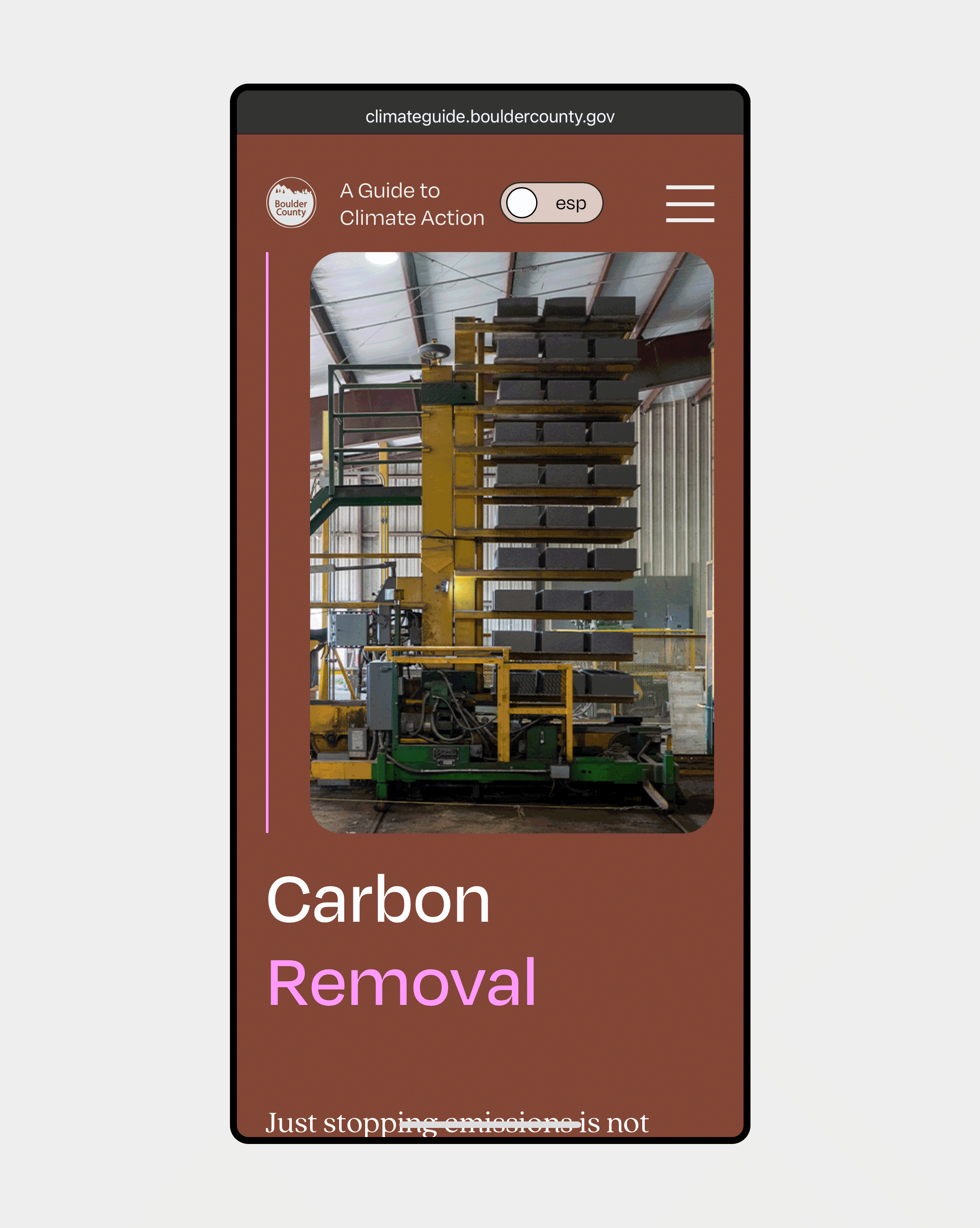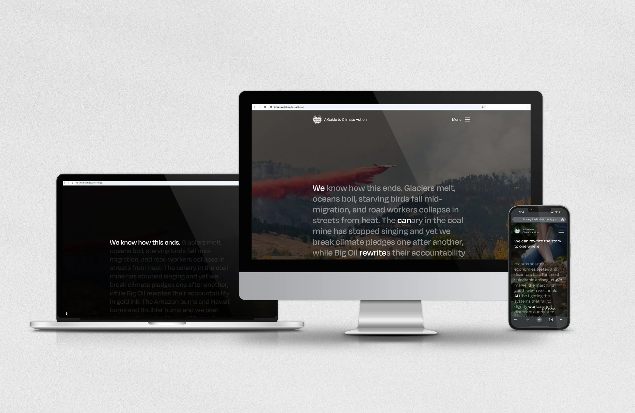 The design and development of a public-facing website that shares Boulder County’s Climate Action Plan and initiatives helping the county reach its climate goals. The storytelling was focused on an engaging, accessible, unified narrative that could display real-world impact and community voices. This narrative needed to connect and contextualize Boulder’s local climate work to the larger, global climate crisis.