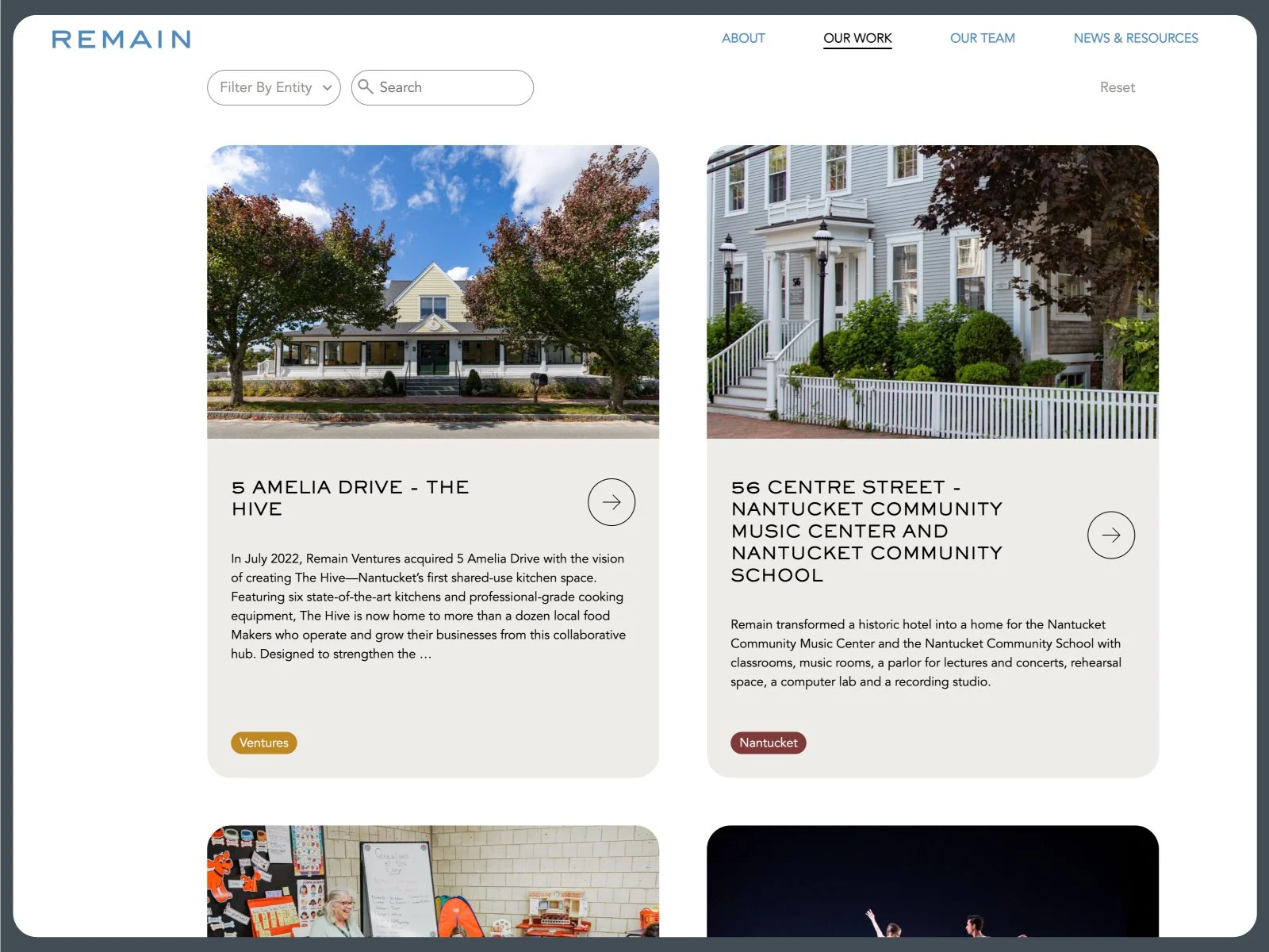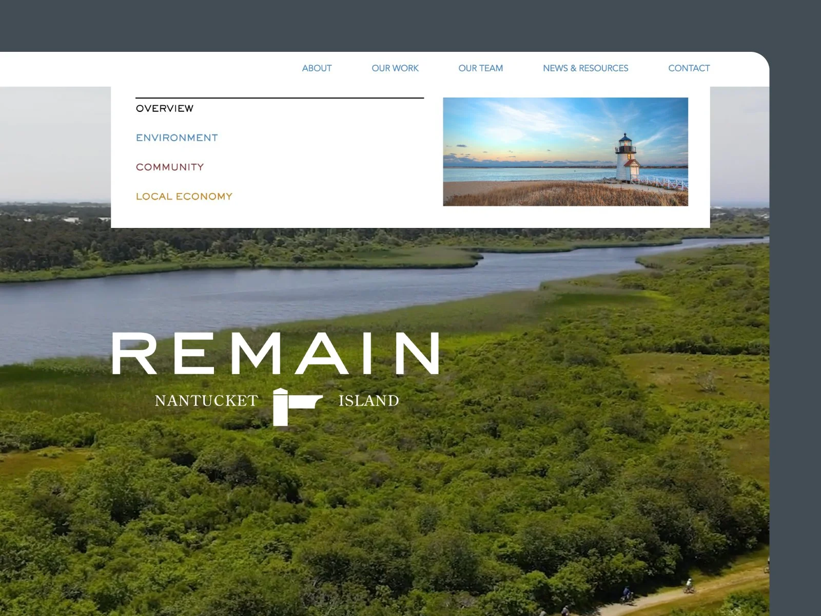 A non-profit with the belief that Nantucket can serve as a microcosm for innovation and a model for expanded philanthropy positively impacting small communities. Over the years, Remain has supported initiatives that serve the community, the environment, and bring economic vitality to the people and place. They needed a brand and website that reflected their local roots, vibrancy and put the work first.